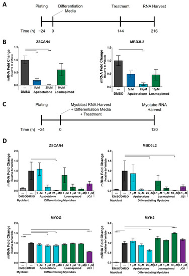 We next compared downregulation of DUX4 target genes by BETi with that of losmapimod. Losmapimod is a p38α/β MAPK inhibitor and a FSHD therapeutic candidate, which has been shown to inhibit DUX4 expression in multiple FSHD1 and FSHD2 cell lines [29]. Losmapimod was selected as a comparator compound due to its documented inhibition of DUX4 and its advanced clinical development. We first tested losmapimod’s effect on expression of DUX4 target genes in differentiated FSHD myotubes (Figure 4A), where 10 µM losmapimod did not alter expression of DUX4 target genes (Figure 4B). Losmapimod treatment was previously reported to inhibit DUX4 target gene expression at much lower concentrations (MBD3L2 IC50 = 0.03 µM) using a concurrent differentiation/treatment protocol [29], where adherent primary myoblasts were treated with test articles for 120 h in differentiation media (Figure 4C). Under these conditions we found that high concentrations of apabetalone and losmapimod significantly reduced expression of MBD3L2 (Figure 4D), but only apabetalone significantly reduced ZSCAN4 expression. Losmapimod treatment did not impact the expression of the skeletal muscle differentiation marker MYOG, but significantly increased the abundance of MYH2 transcripts at 10 µM (Figure 4D). In contrast, BETi treatment (apabetalone and JQ1) had little impact on MYOG, while 25 µM apabetalone decreased MYH2 transcript levels. Overall, these results suggest that BET inhibition can be an effective strategy to counter DUX4 target gene expression in differentiating FSHD myotubes, with comparable effects to high dose losmapimod.