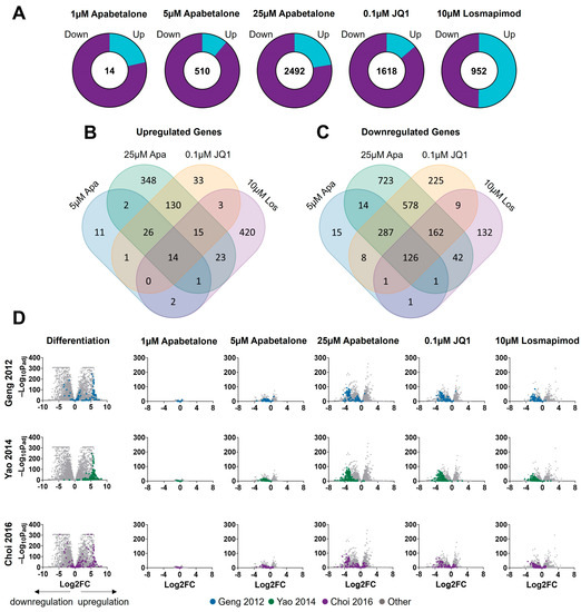 Apabetalone-mediated effects on the myotubes’ transcriptomes were dose dependent. The number of differentially expressed genes compared to the vehicle control increased with increasing concentration of apabetalone, from 14 at 1 µM to 2492 at 25 µM (Figure 5A). The number of differentially expressed genes with JQ1 (0.1 µM) and losmapimod (10 µM) treatment were 1618 and 952, respectively. Most impacted genes were downregulated for each of the BETi treated conditions (78–89% down) (Figure 5A), whereas approximately half of losmapimod-affected genes were upregulated. The overlap in differentially expressed genes between BETi-treated myotubes and losmapimod-treated myotubes was much more significant for the downregulated genes than for upregulated genes. A total of 126 differentially expressed genes were downregulated with apabetalone (5 µM and 25 µM), JQ1, and losmapimod treatment (Figure 5C), whereas only 14 were upregulated by all four conditions (Figure 5B). The vast majority (88%) of differentially expressed genes upregulated with losmapimod treatment were unique to that condition alone, while 72% of losmapimod’s significantly downregulated genes were shared with at least one BET inhibitor.