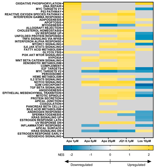 MSigDB Hallmarks is a set of 50 pathways that represent well-defined biological states or processes [46], a number of which are applicable to muscle cells and/or are associated with DUX4 activity. We analyzed changes in these pathways with pHSMC differentiation and in each of our treatment groups (Figure 7). Myogenesis was significantly upregulated by 1 µM apabetalone and 10 µM losmapimod, not significantly affected by 5 µM apabetalone, and significantly downregulated by 25 µM apabetalone treatment and by JQ1. Several pathways with documented links to DUX4 activity and FSHD pathology were significantly impacted by one or more treatments: p53 Pathway [18], MYC Targets V1 [23], MYC Targets V2 [23], Inflammatory Response [16], DNA Repair [52], Reactive Oxygen Species Pathway [52], WNT Beta Catenin Signaling [13], and Apoptosis [8,23]. These findings are also consistent in at least two cases (p53 Pathway, Apoptosis) with differentiation effects on relevant KEGG pathways (Table 2). BET inhibitor and losmapimod treatment demonstrated shared responses in some relevant pathways, including: MYC Targets V2 and Inflammatory Response, which were both significantly downregulated with losmapimod treatment and at least one BET inhibitor condition. Other important pathways, including: p53 Pathway, MYC Targets V1, Reactive Oxygen Species Pathway, Apoptosis, WNT Beta Catenin Signaling, and DNA Repair were differentially regulated between BET inhibition and p38 inhibition. The exact role of these pathways in FSHD is unclear, however they have been linked to DUX4 activity and pathology.