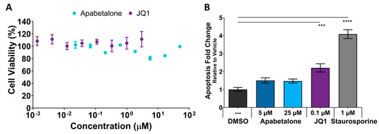 The impact of BETi treatment on differentiated FSHD myotube cell viability and apoptosis were evaluated. Myoblasts were differentiated for six days prior to three-days of test compound treatment (or one day for staurosporine positive control wells). Cell viability was assessed using an MTS-based kit. Neither apabetalone nor JQ1 significantly reduced the viability of the cells at any of the evaluated concentrations (Figure 8A). Apoptosis was evaluated by measuring Caspase 3/7 activity [53]. Apabetalone had no significant impact on Caspase 3/7 activity levels, even at higher concentrations, but JQ1 treatment increased activity by more than 2-fold (Figure 8B). Thus, mild pro-apoptotic effects were associated with JQ1 that did not alter cell viability.