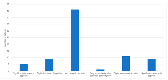 Cannabis has a known effect on appetite hormones [44,45]; nevertheless, the efficacy of cannabis treatment for improving appetite-related symptoms has not been consistently demonstrated in randomized controlled trials [20]. Our results are consistent with most of these studies, showing no net effect of cannabis on appetite: most patients reported no change and a similar number of patients reported an increase or decrease in appetite.