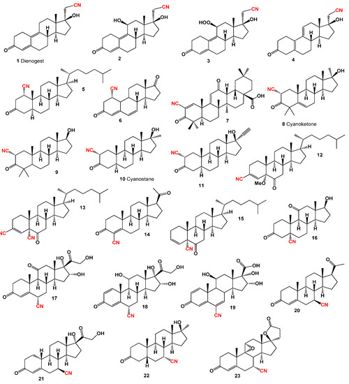 An intriguing series of cyanosteroids, characterized by the presence of a cyano group at the α- or β- configuration in position seven of the B ring of the steroid molecules (20–23), has drawn attention. These synthesized steroids exhibit potential hormone-like properties, displaying activities such as anti-estrogenic, anti-inflammatory, glycogenic, thymolytic, eosinopenic, catabolic, and anti-androgenic effects [67,68].