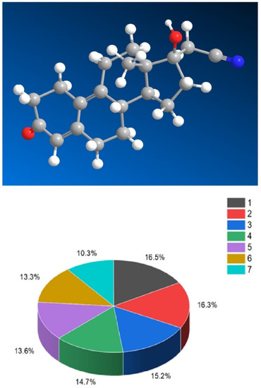3D model and percentage distribution of dominant and related biological activities illustrated by the example of dienogest (1), a widely recognized semi-synthetic 19-nortestosterone derivative with unique pharmacological properties. The activities indicated by the numbers are as follows: 1. Menstruation disorders treatment (16.5%), 2. Menopausal disorders treatment (16.3%), 3. Ovulation inhibitor (15.2%), 4. Contraceptive (14.7%), 5. Anti-inflammatory (13.6%), 6. Androgen antagonist (13.3%), and 7. Endometriosis treatment (10.3%). Dienogest is highly selective for the progesterone receptor, exerting a potent progestogenic effect and a moderate anti-gonadotropic effect. It does not possess androgenic, glucocorticoid, or mineralocorticoid activity. Its resemblance to norethisterone is evident in its remarkable endometrial efficacy, which contributes to the stability of the menstrual cycle in women. Dienogest’s robust endometrial efficacy underlies its application in the treatment of endometriosis and provides anti-proliferative and anti-inflammatory effects for the management of endometriotic lesions. Nitrile group is marked in blue.