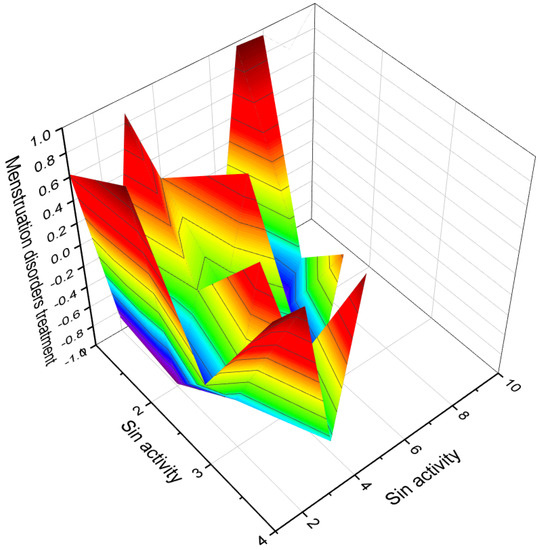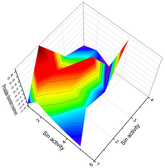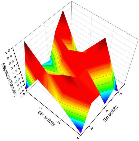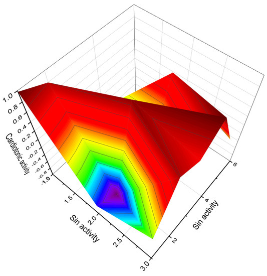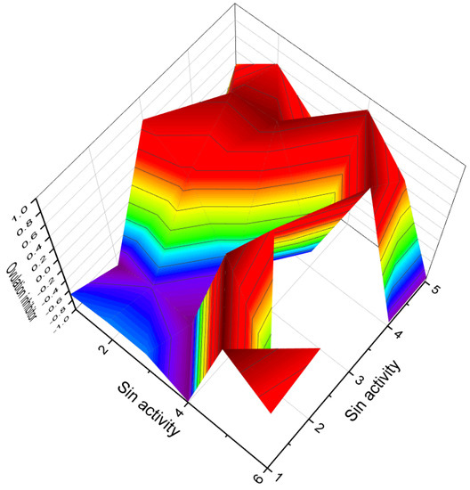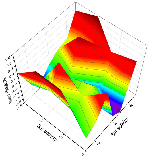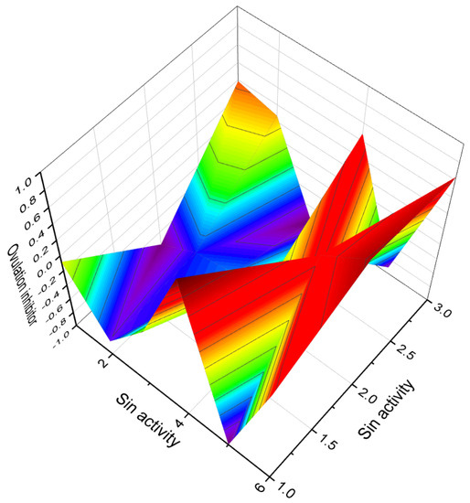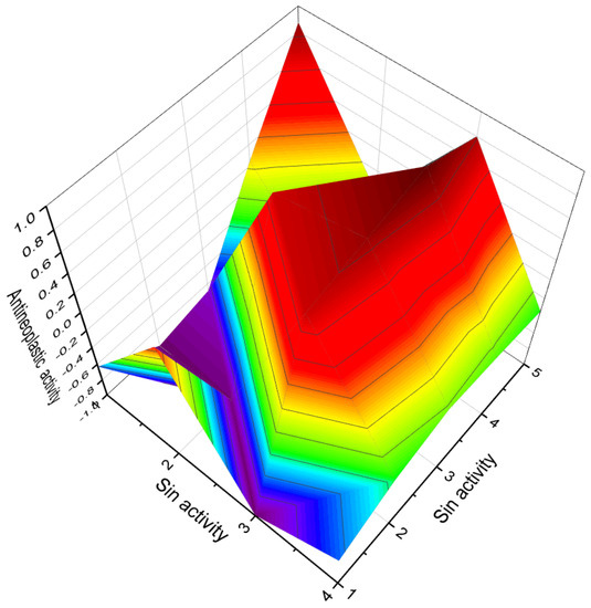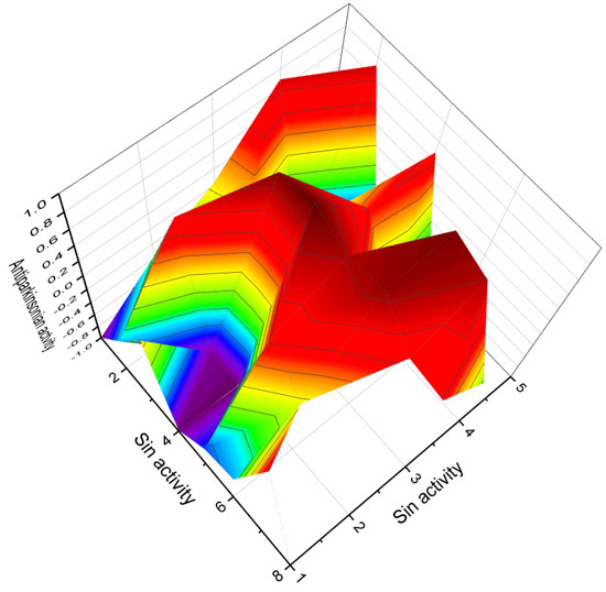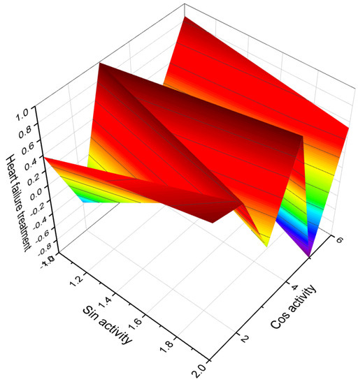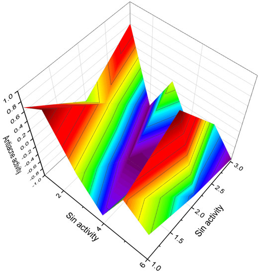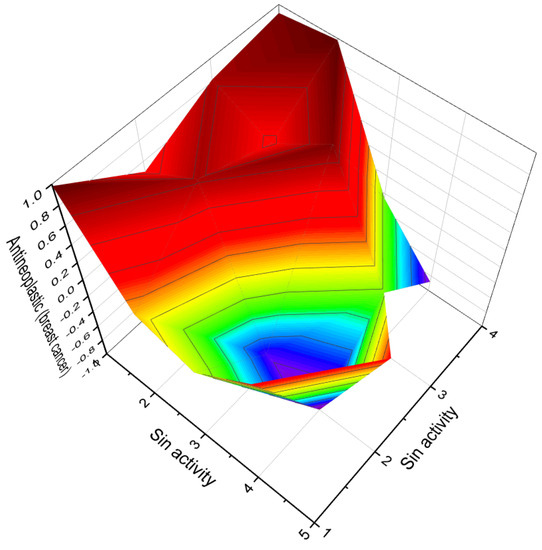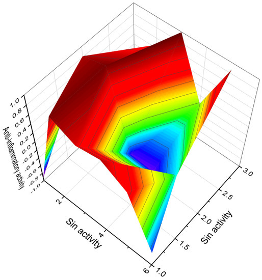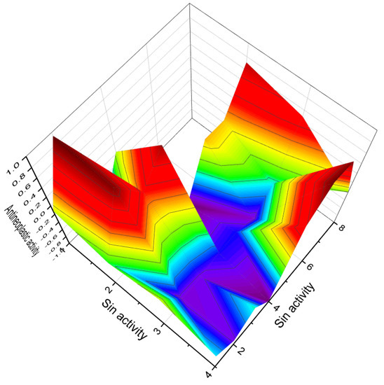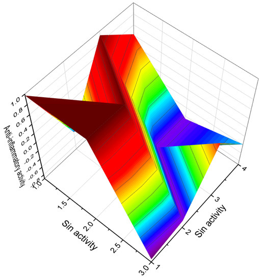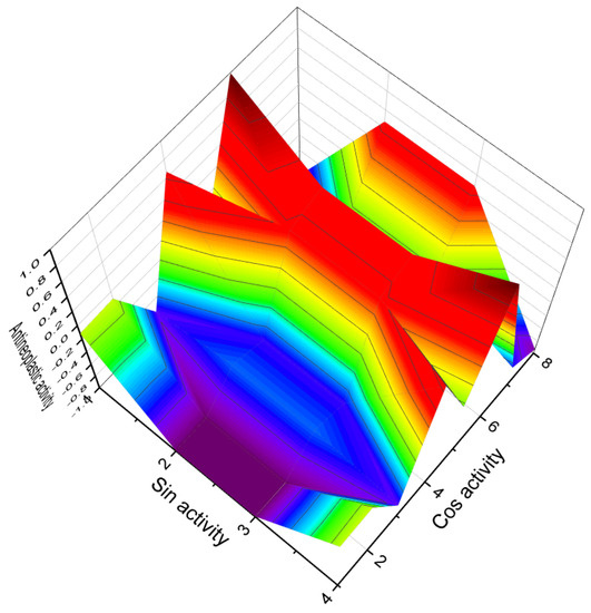 Figure 3 depicts a 3D graph illustrating the predicted and calculated activity of cyanosteroids (1, 2, 4, and 20). These steroids possess properties suitable for the treatment of menstrual irregularities and menopausal disorders and act as potent ovulation inhibitors and contraceptive agents. Similarly, Figure 4 showcases a 3D graph representing the predicted and calculated anti-inflammatory activity of cyanosteroids (17, 18, and 19). These steroids exhibit promising anti-inflammatory properties. Furthermore, Figure 5 displays a 3D graph demonstrating the activity of cyanosteroid (23) associated with the treatment of heart failure and related diseases.