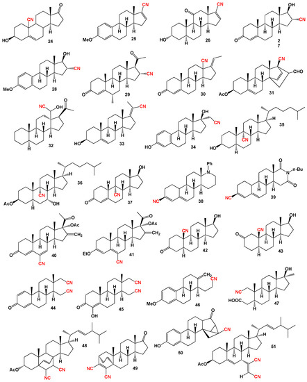 Over 60 years ago, a rare class of 9-cyano steroids (24, structure see in Figure 6) was synthesized by Albert Ercoli and Rinaldo Gardi from Italy. However, the biological activity of these compounds remains unexplored [69]. Another intriguing group is the 17β-cyano estrogens (25), which represent a unique set of hormones that may serve as potential inhibitors of 16α-hydroxylase [70].