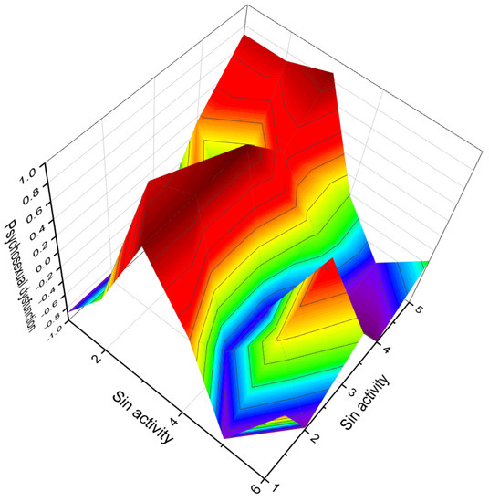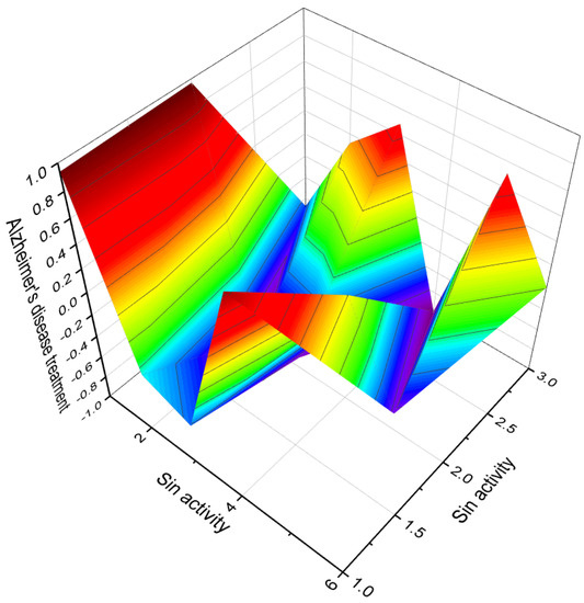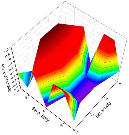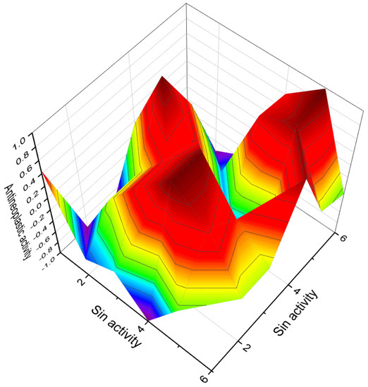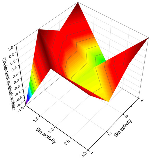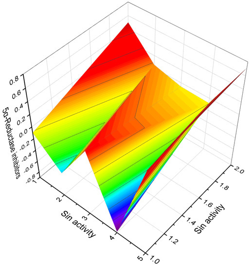 A noteworthy carbon-bridged cyanosteroid (31) was synthesized from 3β-acetoxy-17-cyano-5,14,16-androstatriene using the Diels-Alder reaction. However, the biological activity of this steroid remains uninvestigated [75]. The 20-cyano steroids (32, 33, and 34) were obtained from 17-keto androstanes via 20-keto androstanes using a Witting reaction, but their activity has not been studied [76]. Raggio and Watt described the synthesis of 3β-hydroxy-9α-cyano-cholest-7-ene (35) and 3β-acetoxy- 7α-hydroxy- 9α-cyano-5α-cholestane (36) as potential inhibitors of cholesterol biosynthesis [76]. An anabolic 9α-cyano-19-nortestosterone analog (37) was synthesized, although its biological activity was not assessed [77,78]. Figure 7 presents a 3D plot showcasing the activity of cyanosteroids (32, 35, and 36) as inhibitors of cholesterol synthesis, while Figure 8 displays a 3D plot illustrating the activity of cyanosteroids (38 and 39) as inhibitors of 5α-reductase.