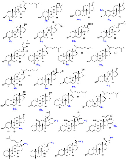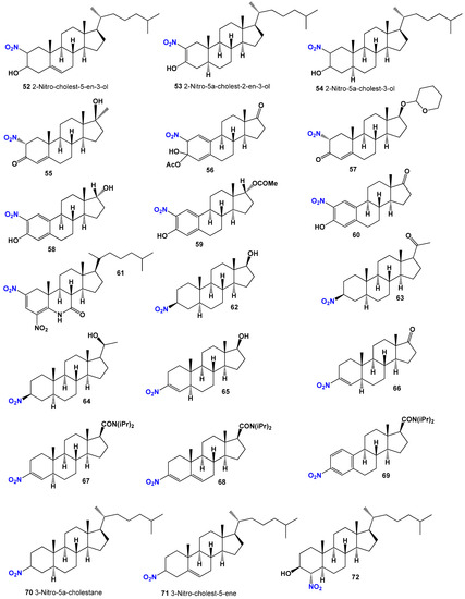 Surprisingly, no naturally occurring steroids containing a nitro group have been discovered thus far. However, there are approximately 300 known synthetic nitrosteroids [86,87,88,108,109,110]. Many of these compounds exhibit noteworthy activities such as antitumor, antibacterial, antifungal, and more [111].