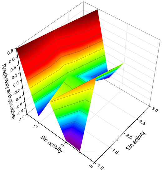 3D Graph illustrating the predicted and calculated activity of nitro-steroids (52, 53, and 54) with over 95% confidence as respiratory analeptics. The term analeptic typically refers to respiratory analeptics, which are central nervous system stimulants encompassing a wide range of drugs used for the treatment of conditions such as depression, attention deficit hyperactivity disorder, and respiratory depression. Nitrosteroids, in this case, serve as rare representatives demonstrating such properties.