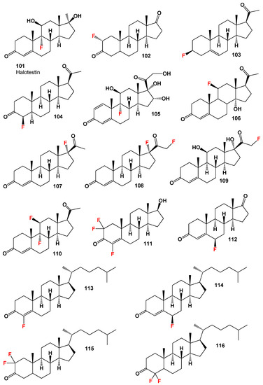 One well-known fluorinated steroid is halotestin (101), which is a 17α-alkylated derivative of testosterone. Halotestin, shown in Figure 15, belonged to the class of active anabolic-androgenic hormones and was synthesized in the late 1950s [172,173]. This steroid is a potent inhibitor of 11β-hydroxysteroid dehydrogenase type 2 and has demonstrated anticancer activity against breast cancer [174,175].