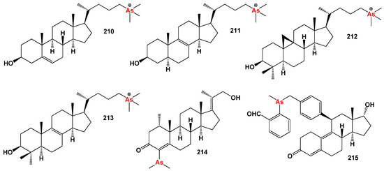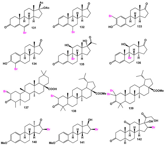 Halogenated steroids form a distinct subset of natural lipid molecules and can be found in various sources such as plants, fungi, marine invertebrates, and seaweeds. Initially, halogenated natural products were considered rare and potentially toxic compounds. However, their number has significantly increased over time and currently exceeds 6000 identified compounds [141,142,143,144,145,146,147,148,149,150,151,152,153,154,155,156,157,158,159,160]. In plants, chlorine-containing steroids are prevalent, while marine organisms contain steroids with chlorine, bromine, and iodine atoms. Interestingly, no naturally occurring fluorine-containing triterpenoids have been discovered [141,142,146,151,160].