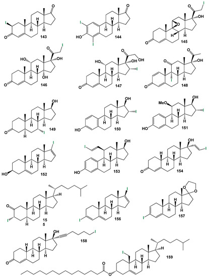 The halogenated steroids discussed in this review are categorized into four groups. The first group comprises steroids incorporating a fluorine atom within their molecular structure. The structures of fluorine-containing steroids are depicted in Figure 1, and their biological activity is outlined in Table 1. The second group includes steroids containing a chlorine atom. The structures of chlorine-containing sterols are shown in Figure 2, alongside their respective biological activities presented in Table 2. The third group focuses on bromine-containing steroids, as illustrated in Figure 3, with corresponding biological activity details provided in Table 3. Lastly, the fourth group explores iodine-containing steroids, with their structures and biological activities presented in Figure 4 and Table 4, respectively.