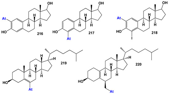 Another series of interest is the 2-fluoro-5α-androstane-3,17-diones, including compound (102, structure see in Figure 15), which was synthesized by Allinger and colleagues [176]. The configuration and conformation of the synthesized steroids were determined; however, their biological activity was not investigated. Additionally, other 2-fluoro androstanes have been synthesized as inhibitors of gonadotropin in pregnancy and for the treatment of menstrual disorders [177].