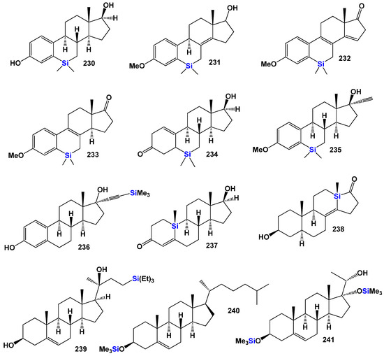 - Pitt, C.; Friedman, A.; Rector, D.; Wani, M. The total synthesis and anti-fertility activity of 6-silasteroids. Tetrahedron 1975, 31, 2369–2377. [Google Scholar] [CrossRef]