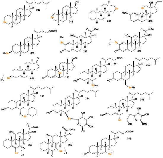 - Ibrahim-Ouali, M. First total synthesis of 11-selena steroids. Tetrahedron Lett. 2009, 50, 1607–1609. [Google Scholar] [CrossRef]