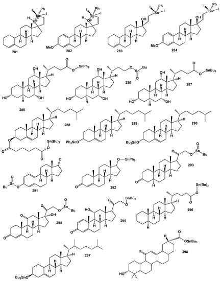 - Yu, V.; Gloriozova, T.A.; Poroikov, V.V.; Dembitsky, V.M. Biological activity of organotin steroids—A brief review. Chem. Res. J. 2017, 2, 205–213. [Google Scholar]