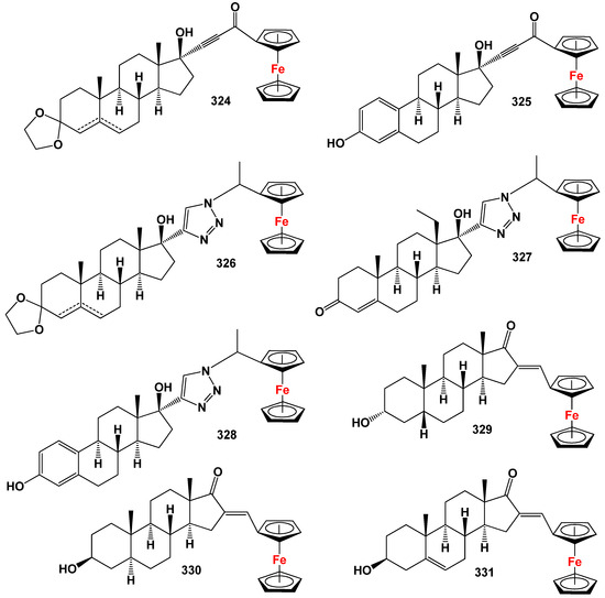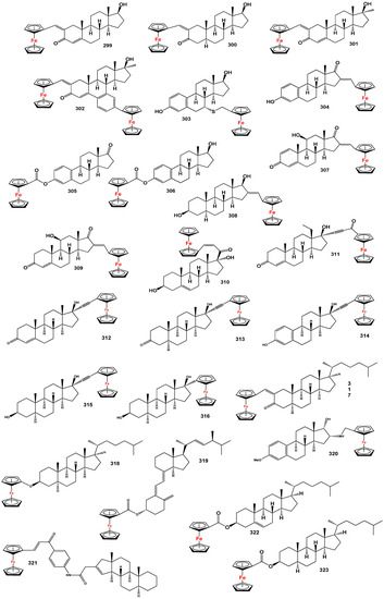- Narváez-Pita, X.; Rheingold, A.L.; Meléndez, E. Ferrocene-steroid conjugates: Synthesis, structure and biological activity. J. Organomet. Chem. 2017, 846, 113–120. [Google Scholar] [CrossRef]