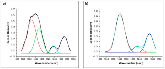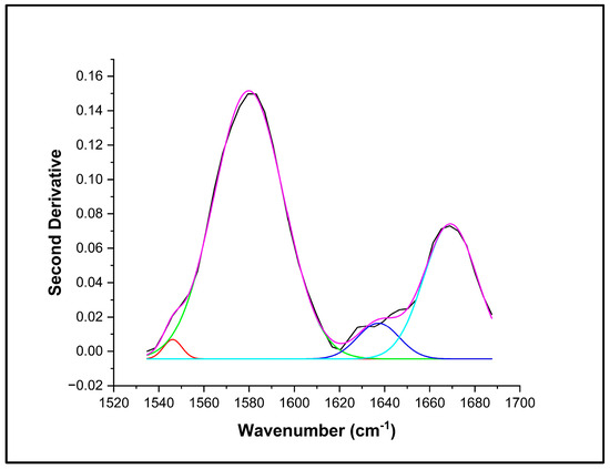 The relative percentage area of each IR band in the region of 1500 to 1700 cm−1 was determined by the second-derivative transformation of raw absorption spectra to resolve overlapping bands using OriginPro 2023 (Origin Lab, MA, Northampton, USA) [62]. Raw spectral data were first normalized, smoothed (SG, 5-points), second derivative-transformed (SG, 7-points), multiplied by (−1) to invert second derivative IR bands, and finally baseline-corrected. Then, absorbance spectra were fitted using full width at half maximum (FWHM) Gaussian band profiles using the Multipeak option (Figure 1). In the fitting process, the height and width of selected IR bands varied until the best fit with the experimental curve (Chi-square tolerance value of 1 × 10−9, <400 iterations) was found. The goodness of the fit was determined by observing the F-statistics and values of Chi-square [63]. In order to test the statistical significance of the relative percentage area of each IR band deconvoluted, one-factor analysis of variance (ANOVA) was performed using OriginPro 2023 (Origin Lab, Northampton, MA, USA). The mean values were compared using Tukey’s test at the 5% significance level.