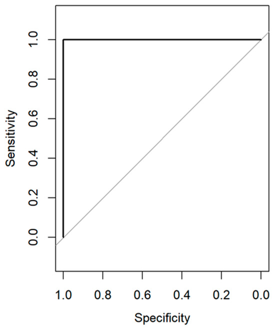 ROC was used to assess the performance of our diagnostic test, evaluating all possible thresholds that determined the result as positive [75]. The area under the ROC curve summarizes the predictive accuracy of the model, where a value closer to one indicates good accuracy [75]. For both cross-validated and external-validated samples, excellent prediction performances were obtained with an AUC of one, reflecting superior accuracy (Figure 6).