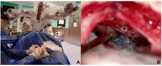 Regarding craniotomy, a single keyhole is made with a self-blocking drill bit, 14 mm below the union of the sigmoid and transverse sinuses, medial and inferior from the asterion (Figure 2C,D); identification of the transverse and sigmoid sinuses is necessary for a safe dural opening [18]. Different from the conventional retrosigmoid approach, we consider a parasterional craniotomy (<20 mm) as sufficient for the cerebellopontine angle exploration to handle vascular compressions associated with TN. This approach not only allows manipulation of the upper cerebellar complex, but also provides an excellent surgical corridor for the middle and lower ones [14,19].