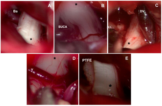 Causes of vascular compression in trigeminal neuralgia. (A) Basilar artery ectasia may be associated with trigeminal neuralgia. (B) The most common vessel identified for causing compression is the superior cerebellar artery. Veins are also identified for causing compression, finding frequently: (C) superior petrosal vein or (D) transverse pontine veins. (V: Vein, A: Artery). (E) Interposition of polytetrafluorethylene interface (PTFE) between the superior cerebellar artery and trigeminal nerve ganglion (*). Ba: Basilar artery. SUCA: Superior cerebellar artery. DV: Dandy vein.