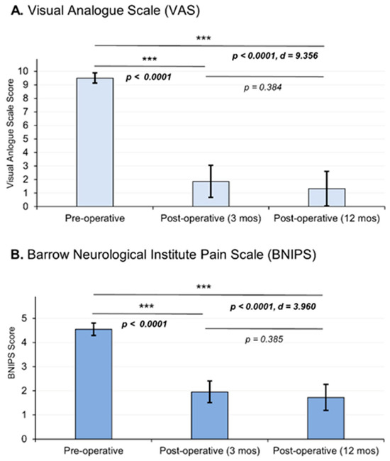 Postoperative pain outcomes were assessed, and the graphical representation illustrates the mean values and standard deviations. Statistical analysis was performed using an analysis of variance (ANOVA) test, followed by post hoc analysis employing either the DMS or C-Dunnett tests. The choice of post hoc test depended on the homogeneity of variances, as determined using Levene’s test. Effect size, measured using Cohen’s d, demonstrated a statistically significant reduction in pain intensity. The pain intensity was measured using two scales: the Visual Analogue Scale (VAS) (A) and the Barrow Neurological Institute Pain Scale (BNIPS) (B). Asterisks show the levels of significance.