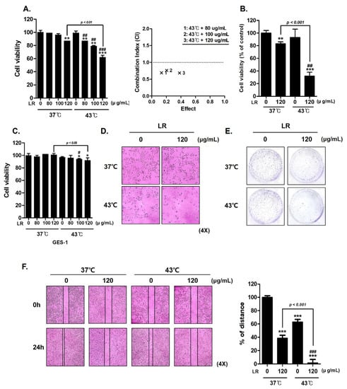 3.2. Cotreatment with LR and 43 °C Hyperthermia Synergistically Inhibits AGS Cell Proliferation