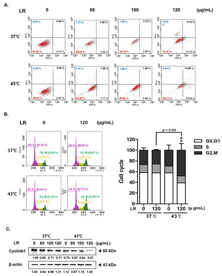 3.4. Cotreatment with LR and 43 °C Hyperthermia Synergistically Induces Apoptosis and Cell Cycle Arrest in AGS Cells