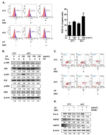 3.6. Cotreatment with LR and 43 °C Hyperthermia Synergistically Increases ROS Generation and MAPK Phosphorylation in AGS Cells