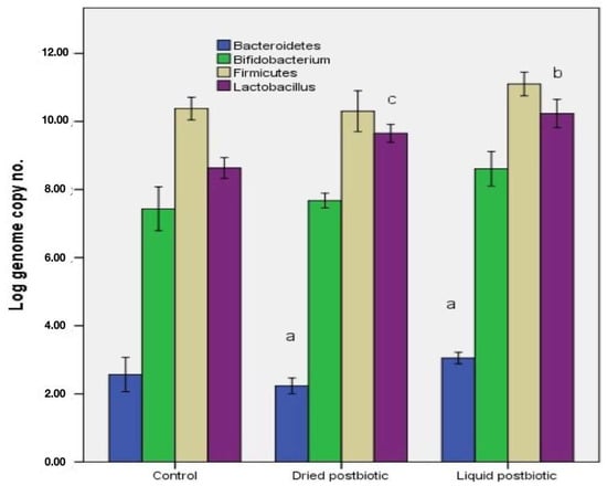 The modulation effect of liquid and dried fermented bee pollen postbiotic on the microbial composition of cardiovascular dysbiosis, determined by the qPCR technique. Different letters represent significant statistical differences (p ≤ 0.05) between samples and control, n = 3.