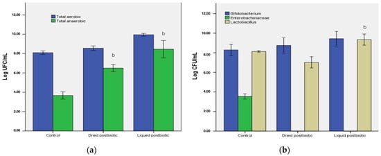 The modulation effect of liquid and dried fermented bee pollen postbiotic on the microbial composition of cardiovascular dysbiosis, determined by a microbiological method. (a) Total aerobic and anaerobic counts on non-selective media; (b) Lactobacillus spp., Bifidobacterium spp. and Enterobacteriaceae counts on selective media (MRS agar, BSM agar, MacConkey agar). Different letters represent significant statistical differences (p ≤ 0.05) between samples and control, n = 3.