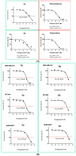 (A) IC50 of compounds 3a, 5b, doxorubicin and tamoxifen in MCF-7 breast cancer cells. (B) Lead compounds, 3a and 5b, produce loss of cell viability in MDAMB231, BT–549 and SUM159PT cells. The IC50 was calculated. Data represents triplicate determinations.