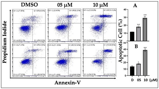 Evaluation of apoptosis in MCF-7 cells induced by lead compounds (5b, A and 3a, B) at 5 and 10 μM for 24 h. Control MCF–7 cells or MCF–7 cells treated with lead compounds (5b, A and 3a, B) were stained with Annexin V–AbFluor™ 488/PI Apoptosis Detection (Abbkine, KTA0002, Wuhan, China) followed by flow cytometry analysis. The percentage of apoptotic cells is indicated. Significant changes from the control group are shown by (* p < 0.05, *** p < 0.01) of three independent assays.