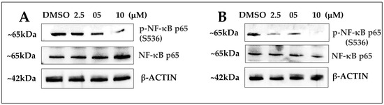NF–κB activation is regulated by the enzyme inhibitor of κB (IκB) and kinase (IKK), which phosphorylates subunit p65 at serine 536, and which inhibits the NF–κB signaling pathway. Western blot analysis was used to examine if the lead compounds impacted the expression of the p65 protein or the levels of phospho–p65 in MCF–7 cells. Lead compounds 5b and 3a, as shown in Figure 6A,B, produce a concentration-dependent decrease of phospho–p65 levels relative to p65 protein expression in MCF-7 cells 24 h after treatment.