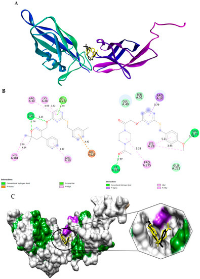 (A) Cartoon representation of both docked compounds 3a (Black) and 5b (Yellow) inside the binding pocket of the p65 subunit of NF–κB; (B) 2D interactions of compound 3a and 5b with the walls of the binding pocket, respectively andshowing bond distance (Å) between respective aminoacid and ligands. Pyrimidine ring of 3a and 4–methoxybenzylthiol group of 5b showed pi–alkyl interaction with Lys28 of p65 subunit of NF–κB; (C) Representation of three-dimensional surface view of docked compounds (3a: Black, 5b: Yellow) inside the grove of NF–κB and its enlarged view for better understandings.