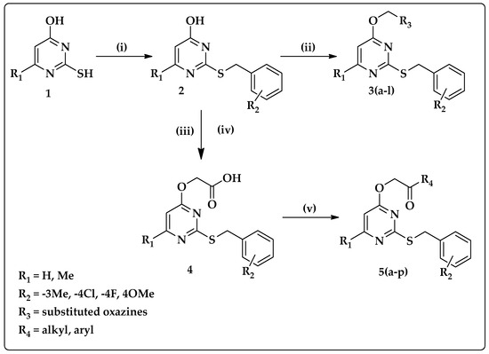 Synthesis of oxazine- and piperazine-clubbed pyrimidine. Reaction Conditions: (i) substituted benzyl chlorides (1.2 mmol), KOH (1.4 mmol), EtOH: H2O (1:1), reflux; (ii) substituted oxazines (1.0 mmol), K2CO3 (2.0 mmol), acetone, reflux; (iii) tert–butylbromoacetate (1.2 mmol), K2CO3 (2.0 mmol), DMF, reflux; (iv) TFA, rt, (v) substituted amines, EDC.HCl, DMAP, Et3N, DCM, rt.