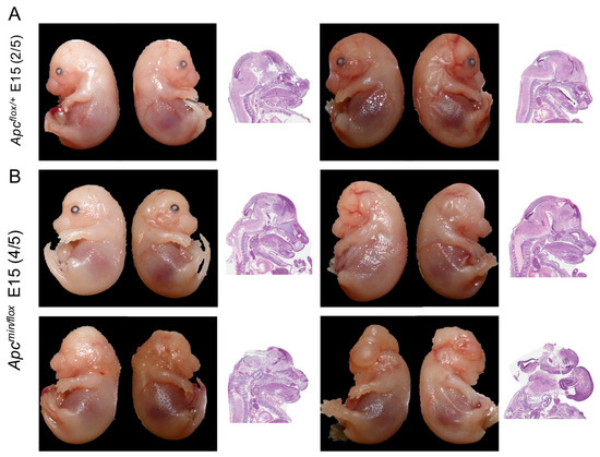 Indeed, expanding the treatment by one more day, i.e., during E5–E7, enabled extension of in utero development of Apcmin/flox embryos past E15. Accordingly, in a prototypic litter of E15 embryos, we found the expected 1:1 Mendelian distribution between Apcmin/flox and Apcflox/+ embryos. Furthermore, of the five Apcmin/flox embryos, two appeared phenotypically indistinguishable from their Apcflox/+ littermates. Meanwhile, three Apcmin/flox embryos harboured cranial abnormalities with different degrees of posterior abnormality, including one Apcmin/flox E15 embryo with a complete head structure but lacking both eyes (bilateral anophthalmia; Figure 1A,B; Figure S1E,F). Collectively, these anecdotal observations suggested a very tight but reproducible treatment window during which administration of WNT signalling inhibitor to pregnant mothers during E5–E7 of embryonic development may result in the birth of live Apcmin/flox pups.