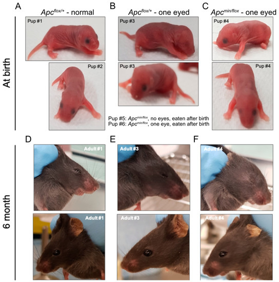 In vivo administration of TNKSi results in live births of Apcmin/flox mice. Pups born alive from Apcflox/flox mice impregnated by Apcmin/+ male mice after treatment with TNKSi at embryonic days 5–7. Pictures were taken on the day of birth (A–C) and at 6 months of age (D–F). Genotype and eye phenotype are as indicated. # indicate individual new-born and adult mice.
