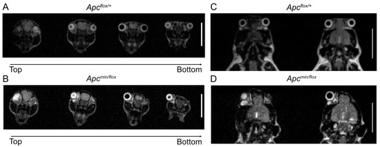 Development of cranial features in treated Apcflox/+ and Apcmin/flox mice. T2 MRI head scans of 6-month-old Apcflox/+ and Apcmin/flox mice taken from an axial (A,B) and coronal view (C,D). Each image in the axial plane represents a slice taken from the top of the head to the bottom. Scale bar = 1 cm.