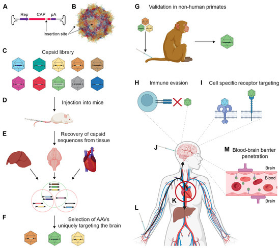 Overview of AAV capsid-directed evolution discovery process for increased brain tropism. (A) Randomized insertions are made within the ORF of the cap gene. (B) The insertions correspond to positions known to give rise to protrusions within the assembled rAAV capsid; for example, they may target the inner face of 3-fold protrusions shown in yellow. (C) The library is assembled in HEK293T cells. (D) This library is then intravenously injected into mice. (E) Once the virus has been systemically distributed within the body and transduction of cells has occurred, the capsid sequences of rAAV vectors are retrieved from organs of interest and characterized by PCR and next generation sequencing. (F) Only sequences that uniquely targeted the brain are selected for downstream use as vehicles for delivering rAAVs to the CNS. (G) The selected rAAVs are reassembled, then validated through injection into NHPs. (H) In addition to tropism, capsids can be optimized for immune evasion. (I) Alternatively, rAAV vectors can be selected for binding to specific receptors. (J,K) Properties of interest of rAAV vectors are dependent on the downstream application. If the intended application is based on (J) intracerebral or (L) intravenous injection. For instance, rAAV vectors intended for intravenous therapy are assessed for their ability to de-target other organs, such as the (K) liver or heart. (M) A major consideration in choosing the delivery route is the ability of a capsid to penetrate the BBB. The figure was assembled with Biorender (https://app.biorender.com/illustrations/6360a504d90edadbfb595fc5, accessed on 1 July 2023).