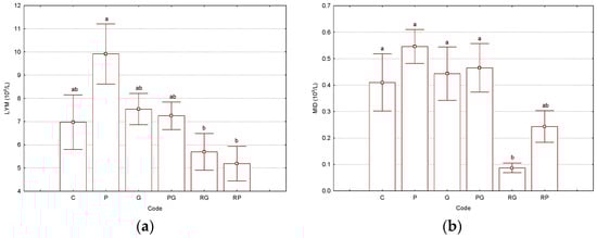 Results for the selected hematological parameters LYMs—lymphocytes, 109/L (a) and MIDs—middle cells, 109/L (b), determined from the Wistar rat blood samples (“C”—control group, “P”—group treated with cisplatin, “G”—group treated with “empty” γ-cyclodextrin, “PG”—group treated with γ-cyclodextrin/cisplatin binary complex, “RG”—group treated with γ-cyclodextrin/resveratrol binary complex, “RP”—group treated with γ-cyclodextrin/resveratrol/cisplatin ternary complex). Bars with different letters are significantly different, according to the Tukey HSD test (p < 0.05). All p-values are presented in the Supplementary Materials file (Tables S5–S22). The number of replicate determinations was n = 6. The “Whisker”-type representation with average values and error bars (±0.95·standard error) is used.