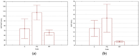 Results for the selected liver-related parameters GOT/AST (glutamic-oxalacetic transaminase/aspartate transaminase, IU/L) (a) and GGT (gamma-glutamyl transferase, IU/L) (b), determined from the Wistar rat plasma samples (“C”—control group, “PG”—group treated with γ-cyclodextrin/cisplatin binary complex, “RP”—group treated with γ-cyclodextrin/resveratrol/cisplatin ternary complex). The Tukey HSD test (p < 0.05) was used for the evaluation of the statistical significances (no statistically significant differences were observed). All p-values are presented in the Supplementary Materials file (Tables S23–S26). The number of replicate determinations was n = 6. The “Whisker”-type representation with average values and error bars (±0.95·standard error) is used.