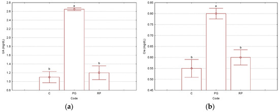 Results for the significant kidney-related parameters: UA—uric acid, mg/dL (a) and Cre—creatinine, mg/dL (b), determined from the Wistar rat plasma samples (“C”—control group, “PG”—group treated with γ-cyclodextrin/cisplatin binary complex, “RP”—group treated with γ-cyclodextrin/resveratrol/cisplatin ternary complex). Bars with different letters are significantly different, according to Tukey HSD test (p < 0.05). All p-values are presented in the Supplementary Materials file (Tables S27–S33). The number of replicate determinations was n = 6. The “Whisker”-type representation with average values and error bars (±0.95·standard error) is used.