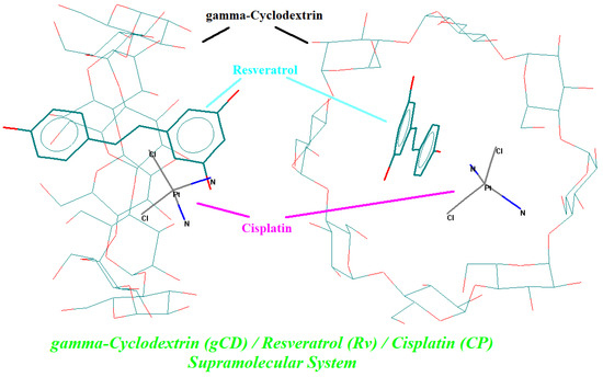 Molecular-modeled γ-cyclodextrin/resveratrol/cisplatin ternary complex at the minimum energy stage, obtained by MM+ geometry optimization; guest compounds are in bold (resveratrol—cyan; cisplatin—pink).