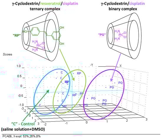 PC2, PC3 versus PC1 scores plot (3D representation) from the PCA analysis of the significant biochemical parameters (T-Bil, UA, Cre, T-Pro, Alb, Ca, Mg, and IP) determined from the Wistar rat plasma samples (“C”—control group, “PG”—group treated with γ-cyclodextrin/cisplatin binary complex, “RP”—group treated with γ-cyclodextrin/resveratrol/cisplatin ternary complex).