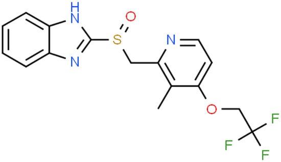 The chemical structure of lansoprazole (obtained from ChemSpider chemical structure database, http://www.chemspider.com/, accessed on 28 September 2023).