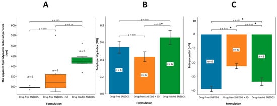 Influence of SNEDDS loading and combination with SD on (A) particle apparent hydrodynamic radius, (B) PDI (polydispersity index), and (C) ZP (zeta potential). SNEDDS (self-emulsifying drug delivery system), and SD (solid dispersion prepared using Pluronic-F127 by lyophilization method). The PS data were statistically analyzed by Kruskal–Wallis H followed by the Dunn post hoc test (Bonferroni correction) while the PDI and ZP data were analyzed by ANOVA followed by Tukey’s post hoc test. A significant p-value (<0.05) is marked with an asterisk (*). Outliers in the dataset were symbolized using a diamond shape (◆).