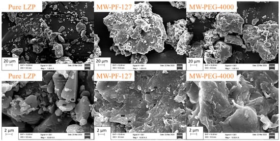 SEM images of pure LZP and MW-SD formulations (MW-PF-127 and MW-PEG-4000).