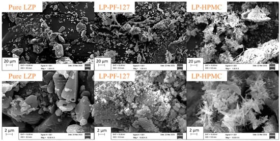 SEM images of pure LZP and prepared LP-SD formulations (LP-PF-127 and LP-HPMC).