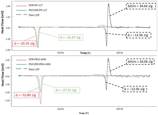 DSC spectra of pure LZP and MW-SD formulations (MW PF-127 and MW-PEG-4000) along with their corresponding physical mixture.