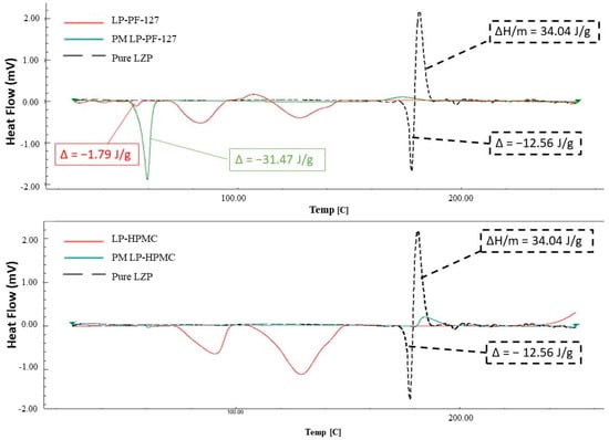 DSC spectra of pure LZP and LP-SD formulations (LP-PF-127 and LP-HPMC) along with their corresponding physical mixture.